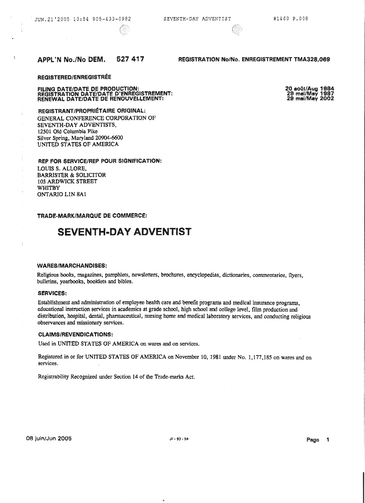 Actualizacion 10/10/06: La Conferencia General de ASD esta ahora amenazando al Pastor “Chick” con una carta de demanda relacionada a un nombre de dominio de nosotros, CSDA (ASDC), en Canadá. Ver a continuación las imágenes de la carta y los documentos de la marca registrada en Canadá: