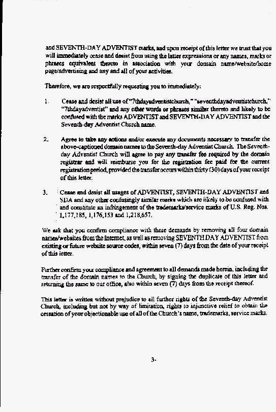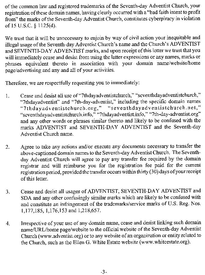 Carta de demanda al propietario de los nombres de dominio Davidianos ASD (Davidian SDA domain names): Pág1, Pág.2, Pág.3, Pág.4