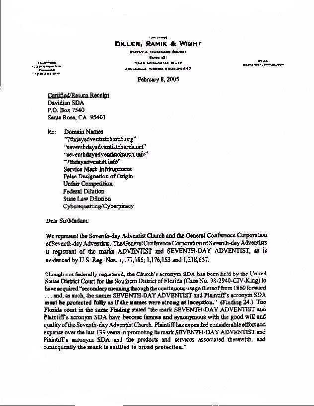 Actualizacion 10/21/05: El Pastor “Chick” ha recibido un carta certificada de los abogados de la Corporación de la Conferencia, demandando la renuncia/rendición de varios nombres de dominio. Esta carta parece, sobre inspección, ser meramente una copia de una carta que se mando anteriormente al propietario de algunos nombres de dominio, usados por el propietario de davidiansda.org, conteniendo solo alteraciones insignificantes (ver esta comunicación con los Davidianos en los enlaces mencionados arriba).De la carta misma, se puede decir que los hechos de la correspondencia se han confundido, ya que ellos(CG) se refieren a comunicaciones con el propietario a través de los ASD Davidianos ( que nunca tomaron lugar), y todos de los nombres de dominio menos uno que la CG cito/fueron usados por los Davidianos...El Pastor “ Chick” ha enviado por correo una respuesta a esta carta certificada .