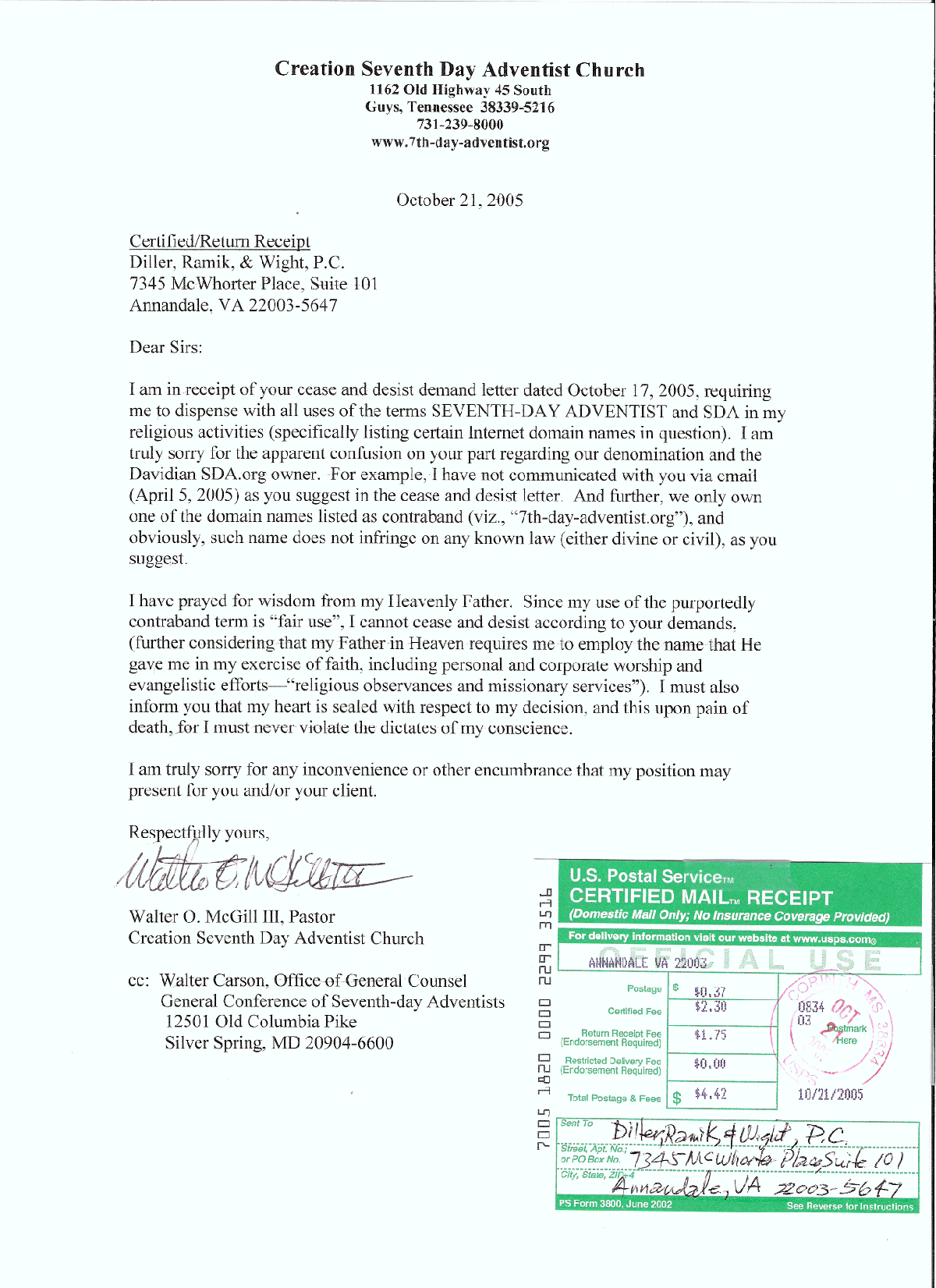 Actualizacion 07/22/05: Al Pastor Walter “Chick” McGill ha hecho una carta a la firma de abogados de la Conferencia General que esta imponiendo la Marca Registrada, pidiéndoles que entiendan por la demora que ha tenido en contestar su carta demanda, ya que el esta presentemente en una misión evangelistica. La Carta puede leerse AQUÍ