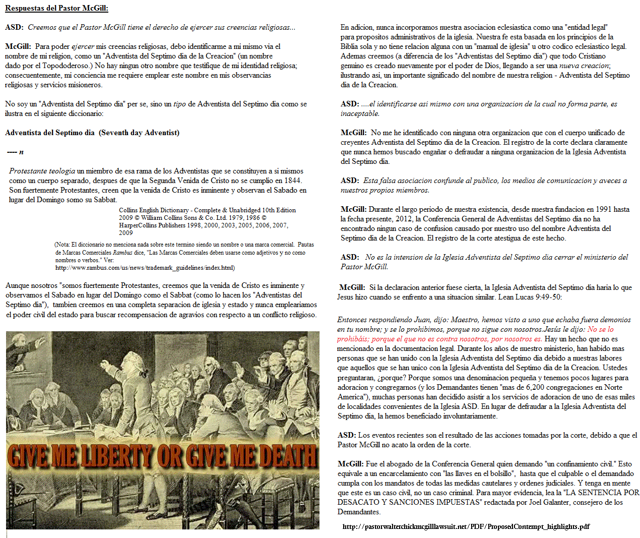 Actualizacion 09/04/08: El juicio se ha trasladado a una fecha aplazada, quedando pendiente una conferencia de mediacion entre el Pastor McGill y los Demandantes para Octubre 2. El proposito de la Conferencia es tratar de llegar a un acuerdo con respecto a los asuntos presentes - el acronimo "S.D.A" (ASD) y el nombre "Adventist" (Adventista. Pastor McGill ha certificado a la corte que el no atendera a la conferencia de mediacion.